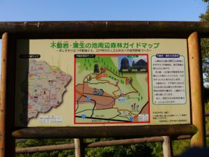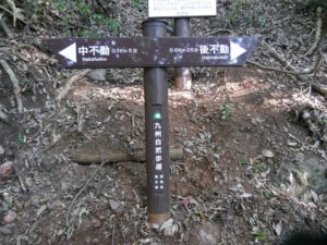 岩からは下方に「前不動」、後ろに「後不動」と駐車場では見えなかったが、いくつもの岩(不動岩)が起立していた。その後、岩からの下り始めたら前面に人が通ったような道ができて、おそらく次の岩につながっているのではと思ったが、結局、案内板まで戻ることにした。