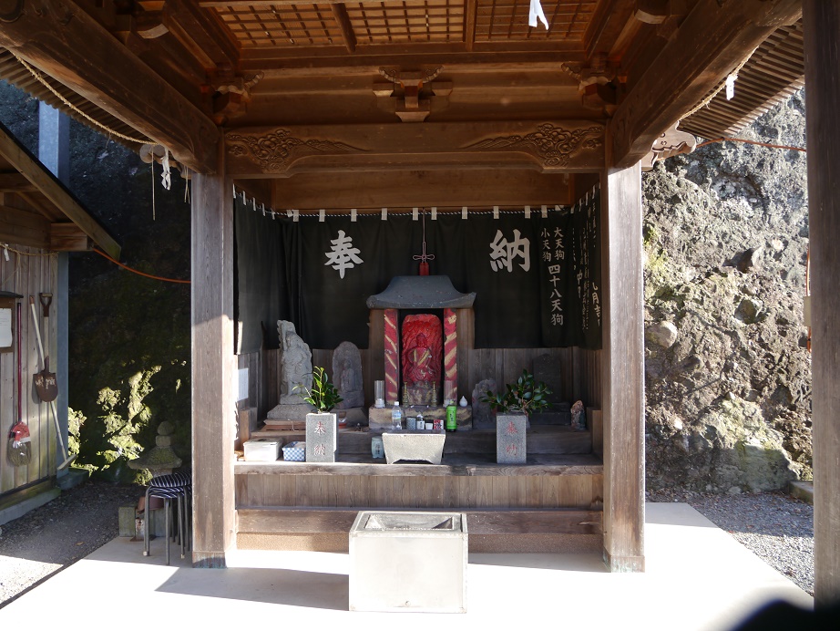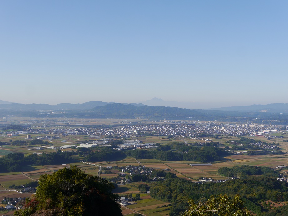 駐車場からは山鹿市街地から遠く熊本辺り、更には普賢岳をも見えて、すばらしい景観である。駐車場には東屋があり、トイレもきれいで整備されている。 不動岩の根っこには「不動神社拝殿」があり、登山の安全をお願いした。