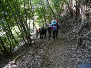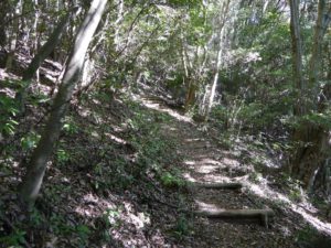 ○ 案内板から「後不動」に向かって急斜を再び進んで行った。途中に「へげ岩,すぐそこ」と書かれた案内があったが、帰りに寄ることとして、そのまま登って行った。登山道は木々に覆われて景色は見えない。