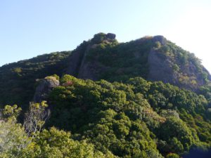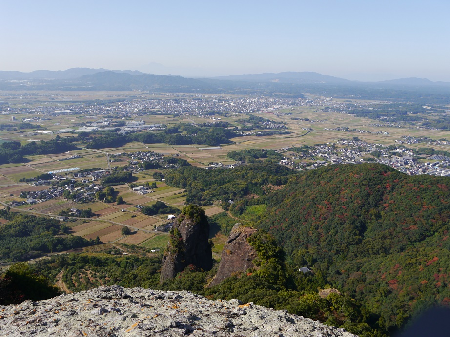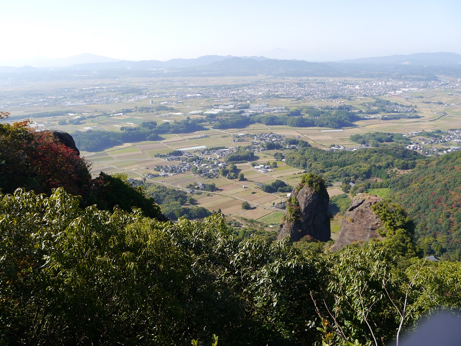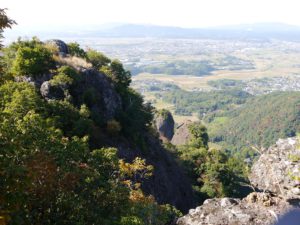 ○ 狭い尾根道を進む、大きな岩にぶち当たりながら、迂回したりして進んで行くと、見晴らしの良い岩の上に立つことができる。しかし、切り立った岩のそばには寄りたくない、少し離れて見る景色は前不動岩や中不動岩を眼下にして、山鹿市が広がっている。