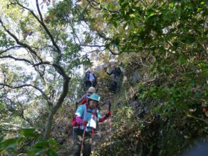 ロープを伝って岩を慎重に下りると、今度はロープの張られた急な崖があり、手前には虎ロープが張られているが、どう見ても危険である。 そのまま行くと、また大きな岩にぶち当たり、周回していくと何か変である。先の道がない、途切れて崖っぷちに突き当たってしまった。