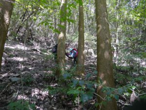 ○ 仕方なく戻って往路の山道へ合流する道を探したが、全く見当たらない。ここで山頂まで戻るのも・・・、とにかく獣道でもと思いながら辺りをさまよって、それらしき形跡から急斜面の林の中に入った。積み積った木の葉で足元がズルズルと滑る。手当たりしだいに木の枝をつかんで下りて行った。